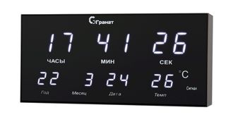 Часы настенные (настольные) электронные сетевые с будильником с температурой, датой и месяцем на циферблате Гранат С-1917T-Бел, с белой индикацией цифр, с питанием от сети 220v, в качественном пластиковом корпусе, оснащены надежным точным электронным механизмом, индикация времени, даты, месяца, температуры, отображение текущего времени в 24 часовом формате. Имеют встроенное резервное питание(на случай перебоев в электросети-дисплей в это время не работает, не светится, сохраняются настройки). Четыре будильника можно установить на разное время. Размер часов: ширина 190 мм, высота 90 мм, глубина 40 мм. Вес изделия 600 грамм.