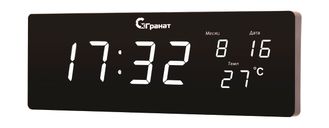 Часы настенные электронные сетевые большие с температурой, датой и месяцем на циферблате Гранат С-2512T-Бел, с белой индикацией цифр, с питанием от сети 220v, в качественном пластиковом корпусе, оснащены надежным точным электронным механизмом, индикация времени, даты, месяца, температуры, отображение текущего времени в 24 часовом формате. Имеют встроенное резервное питание(на случай перебоев в электросети-дисплей в это время не работает, не светится, сохраняются настройки). Размер часов: ширина 516 мм, высота 180 мм, глубина 42 мм. Вес изделия 1800 грамм.