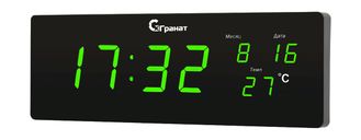 Часы настенные электронные сетевые большие с температурой, датой и месяцем на циферблате Гранат С-2512T-Зел, с зелёной индикацией цифр, с питанием от сети 220v, в качественном пластиковом корпусе, оснащены надежным точным электронным механизмом, индикация времени, даты, месяца, температуры, отображение текущего времени в 24 часовом формате. Имеют встроенное резервное питание(на случай перебоев в электросети-дисплей в это время не работает, не светится, сохраняются настройки). Размер часов: ширина 516 мм, высота 180 мм, глубина 42 мм. Вес изделия 1800 грамм.